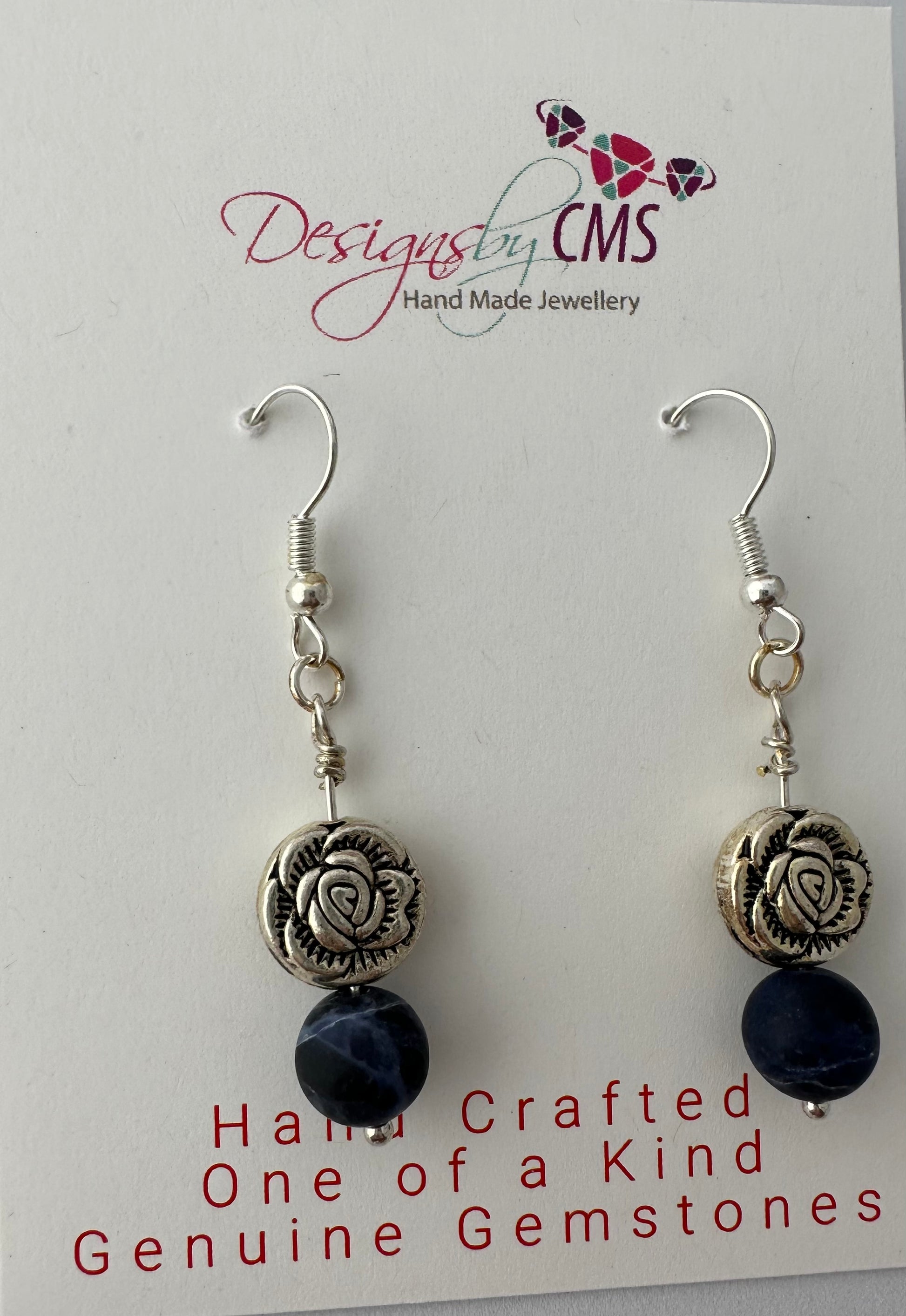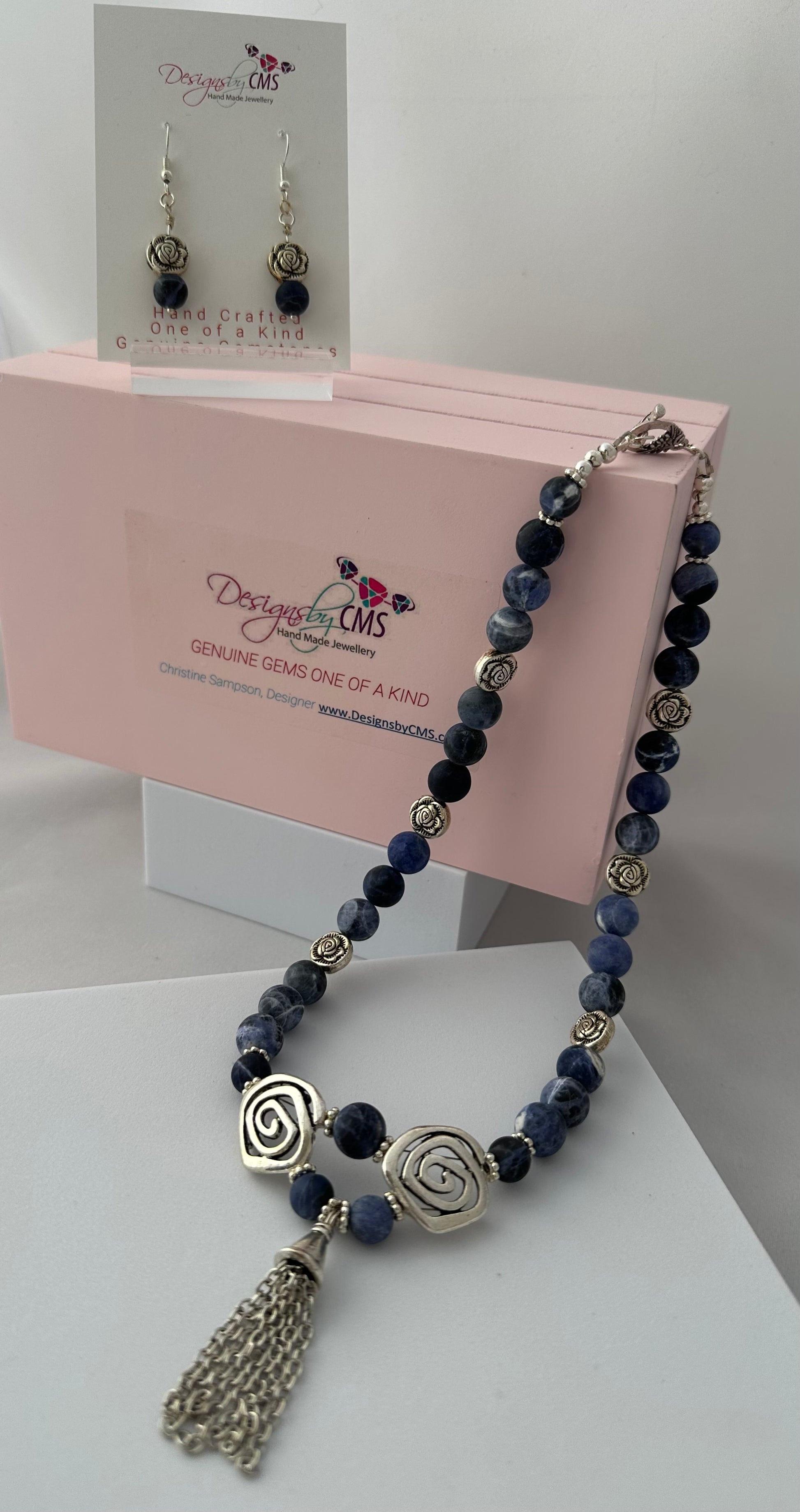 Silver-plated accents, rosettes and swirls, make a striking contrast against the beauty of the variegated dark blue coloured sodalite gemstones. Sodalite instills a drive for truth and enhances intelligence and communication. Length: 18 ¼ ”/46.35cm; Ears 1 ½ ”/3.81cm SKU 2305
