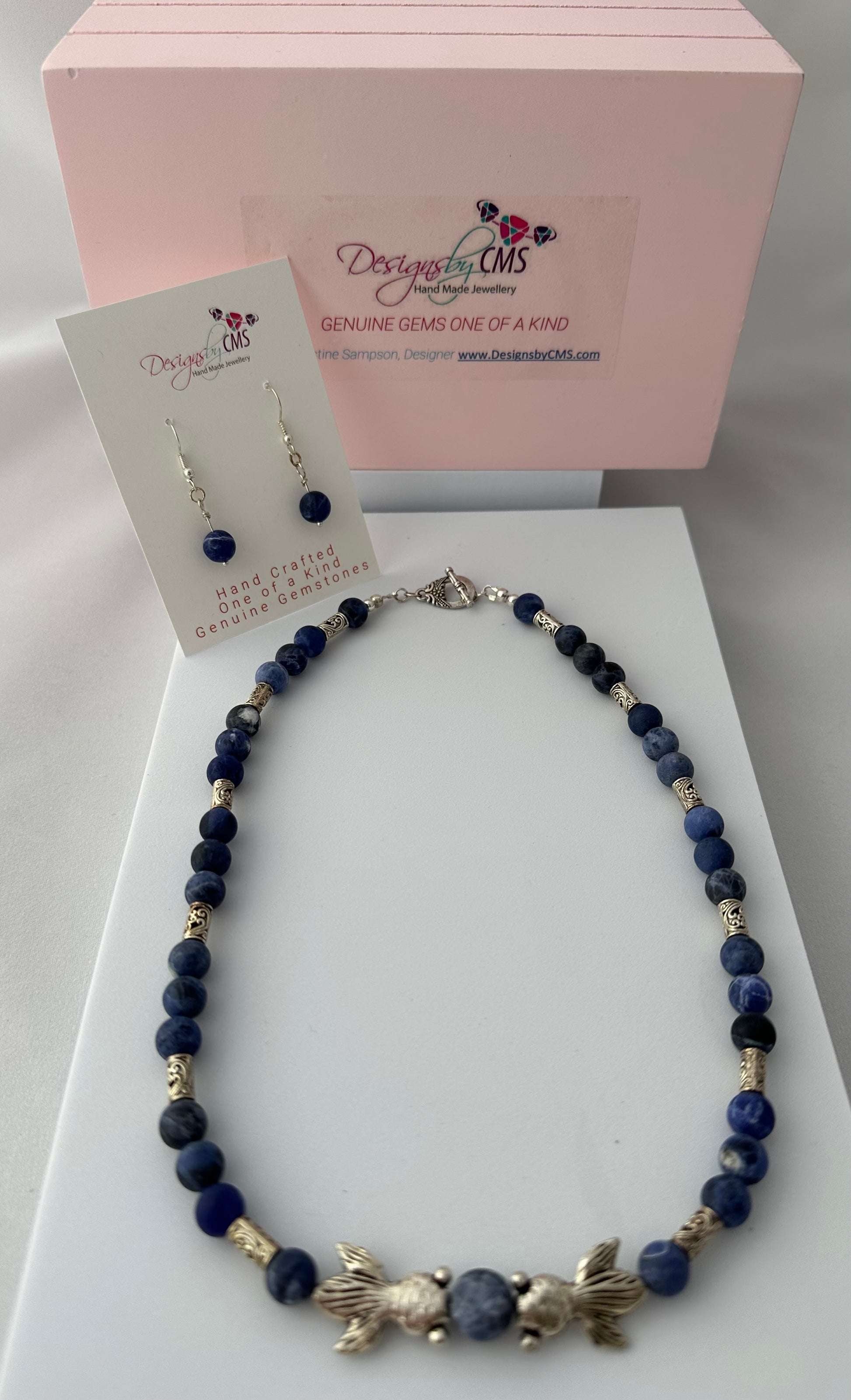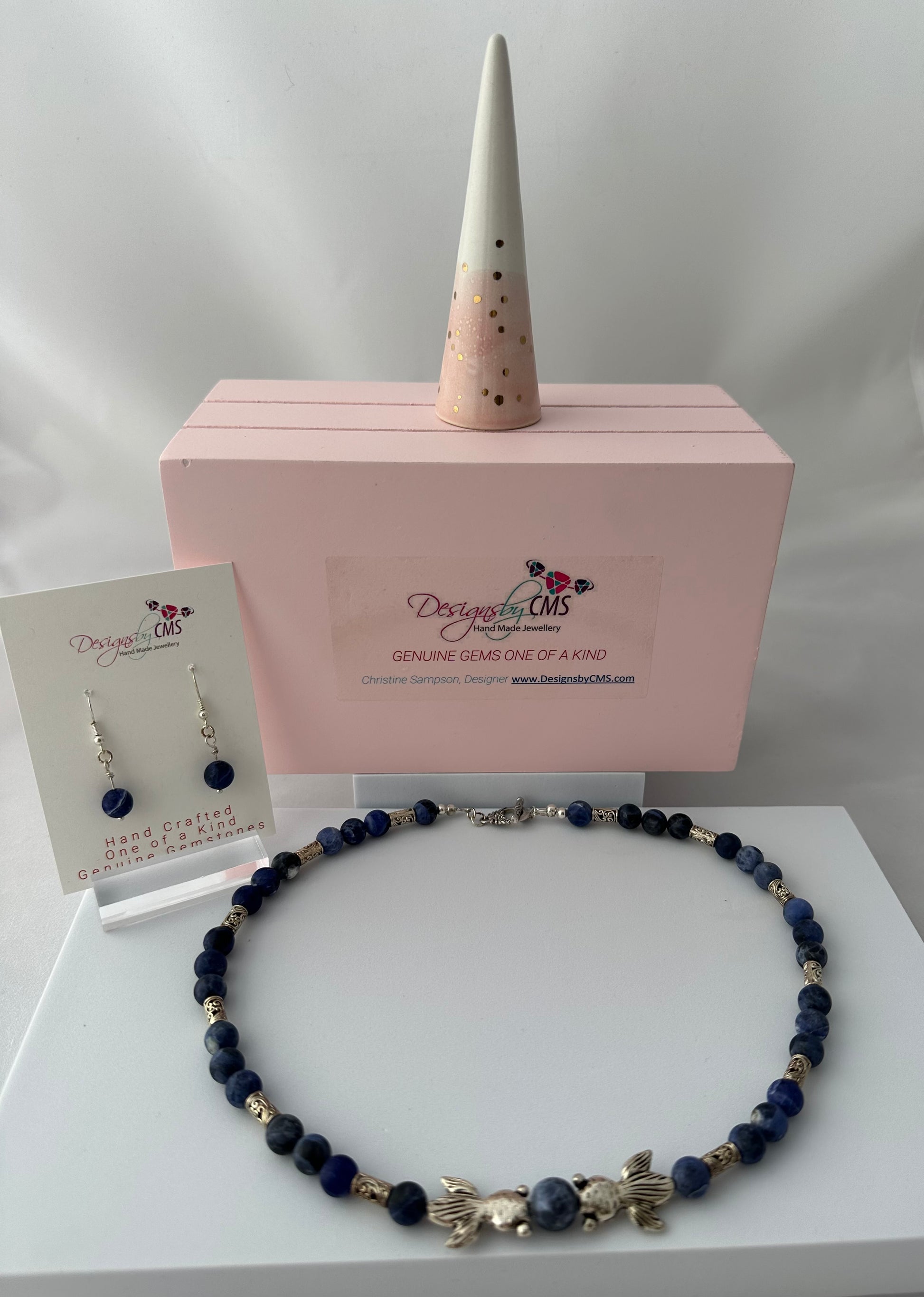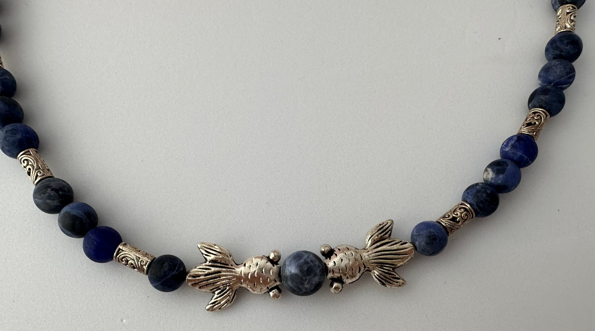 Beautiful beads of deep blue colour with white streaks or flecks. Ornate silver plated bead spacers showcase the natural beauty of the sodalite gemstone. Sodalite brings wisdom, truth, dignity and spiritual mastery. Considered a modern birthstone for Pisces as well as Sagittarius. Length: 19”/48.26cm; Ears 1”/2.54cm SKU 2304 SOLD