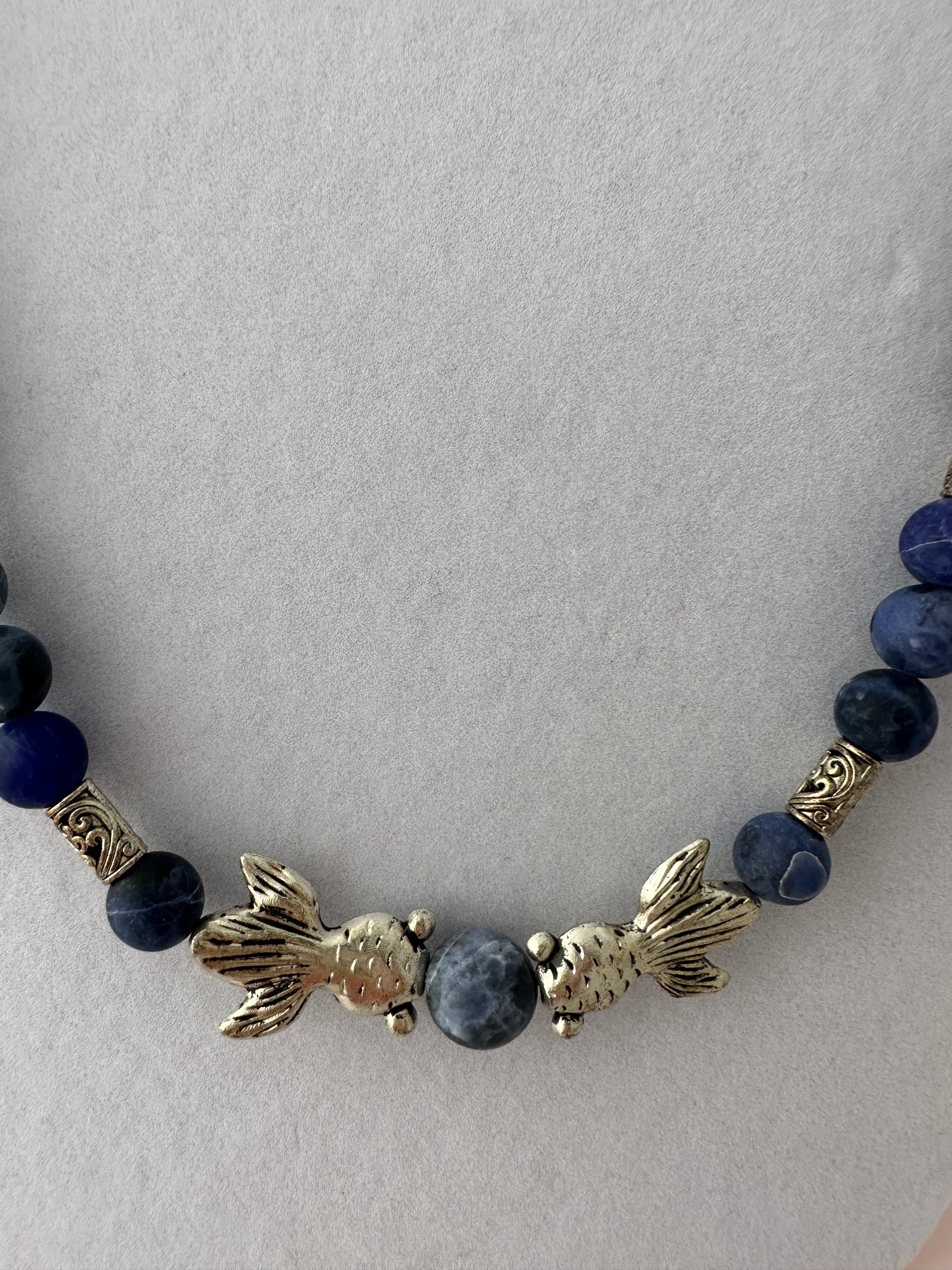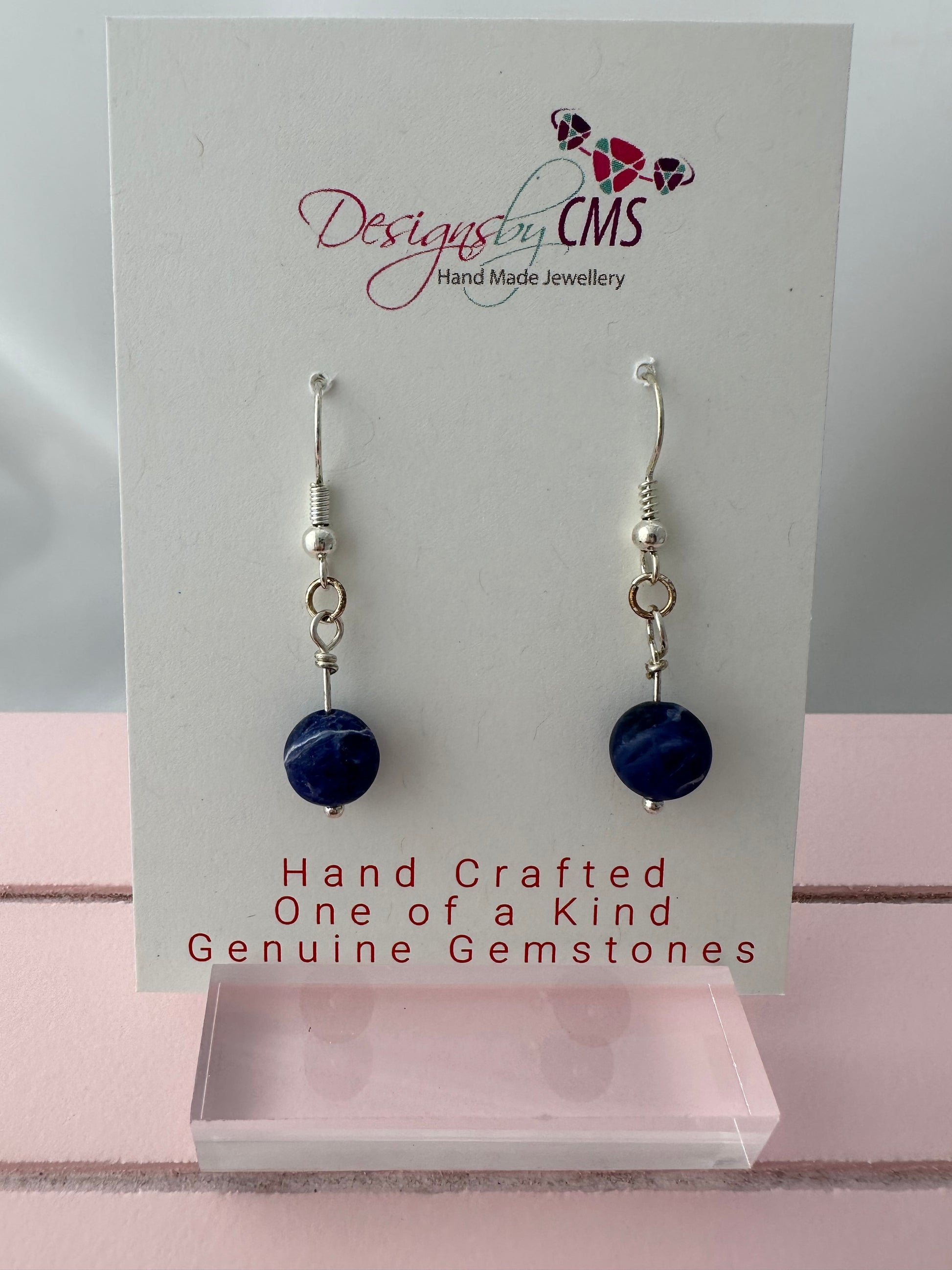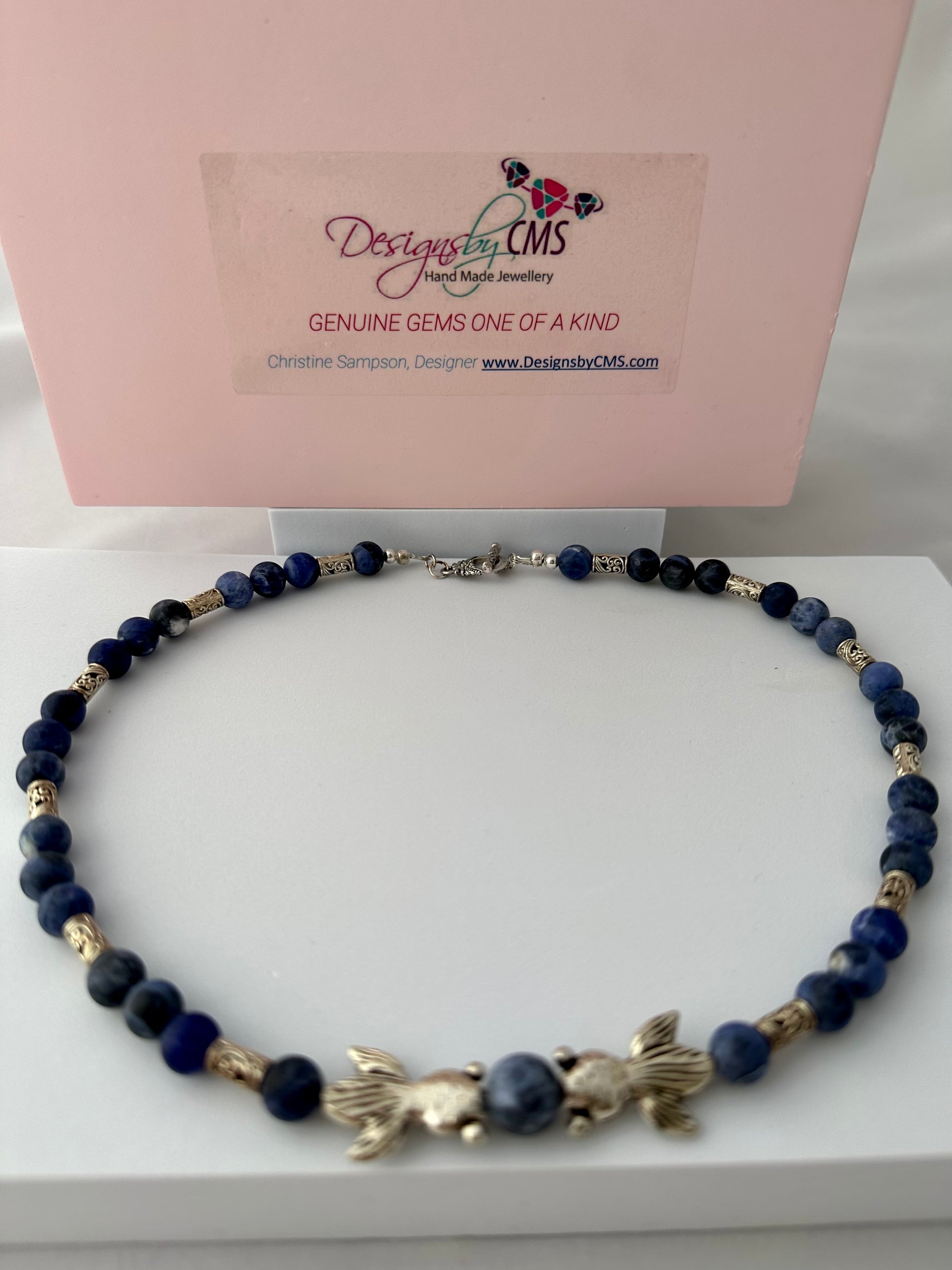 Beautiful beads of deep blue colour with white streaks or flecks. Ornate silver plated bead spacers showcase the natural beauty of the sodalite gemstone. Sodalite brings wisdom, truth, dignity and spiritual mastery. Considered a modern birthstone for Pisces as well as Sagittarius. Length: 19”/48.26cm; Ears 1”/2.54cm SKU 2304 SOLD