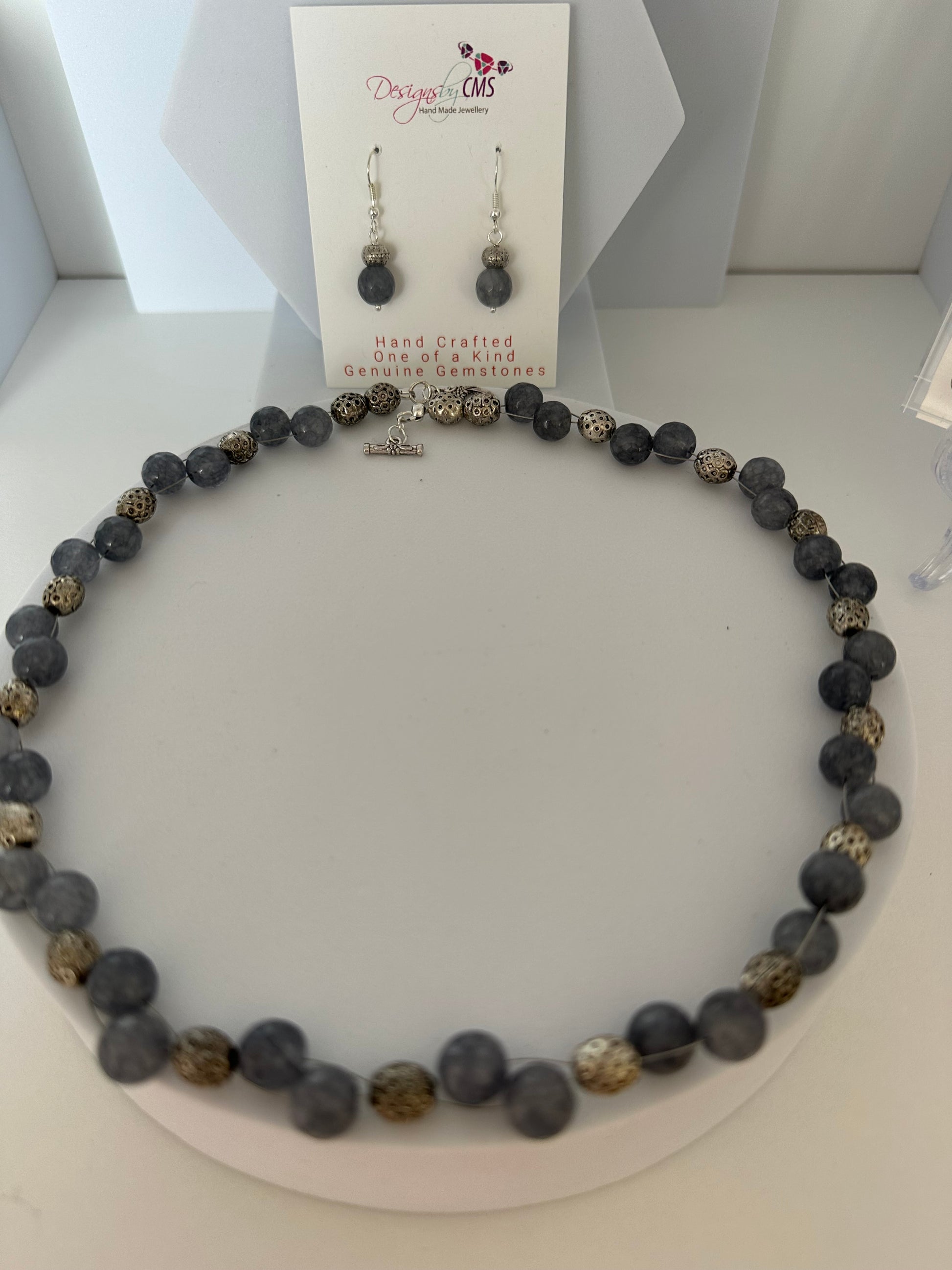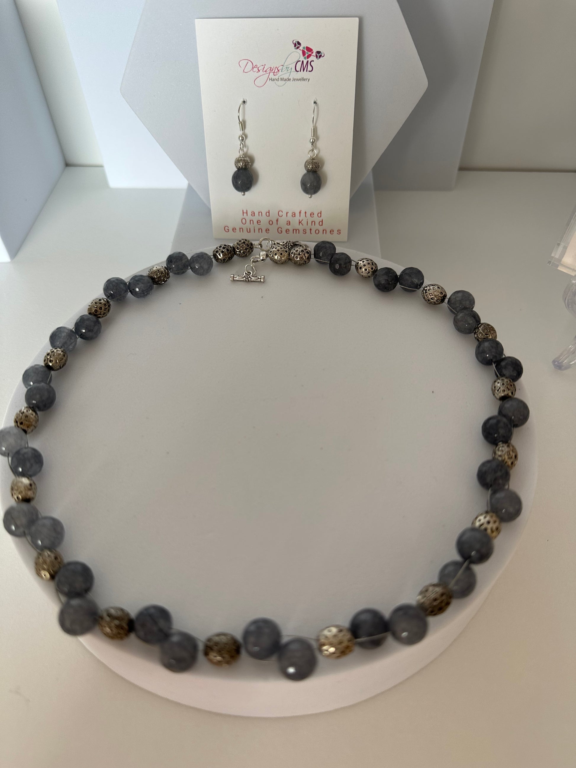 Experience the timeless beauty and subtle energy of Grey Jade, and let its tranquil allure inspire your journey towards inner balance. The faceted beads are interspersed with antiqued silver plated spacers and the necklace features a toggle clasp. Length: 21”/53.34cm;  Ears 1”/2.54cm.  SKU: 2315
