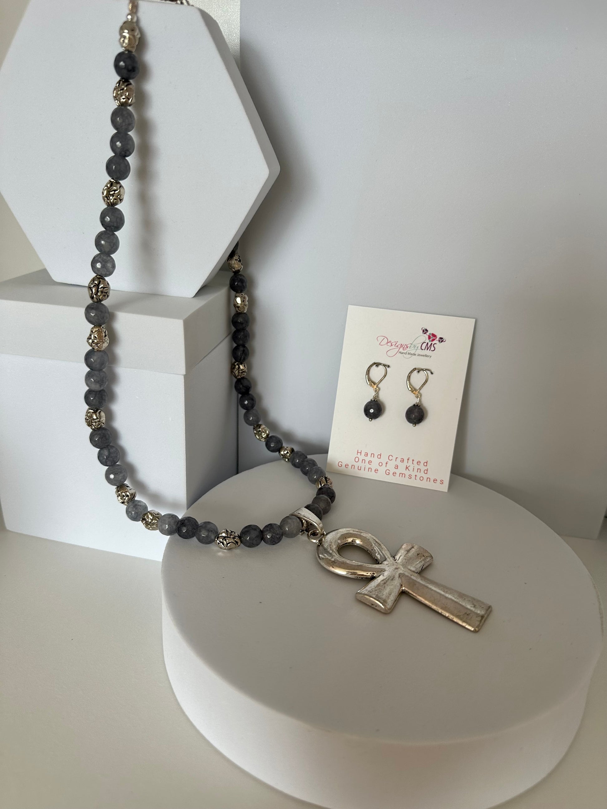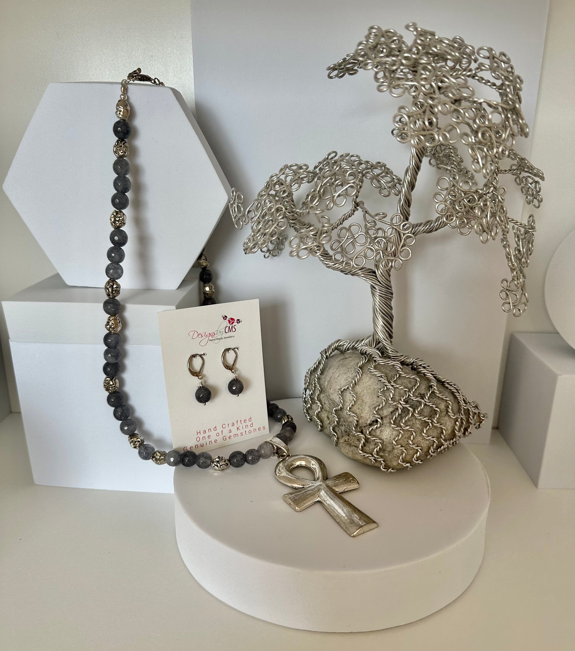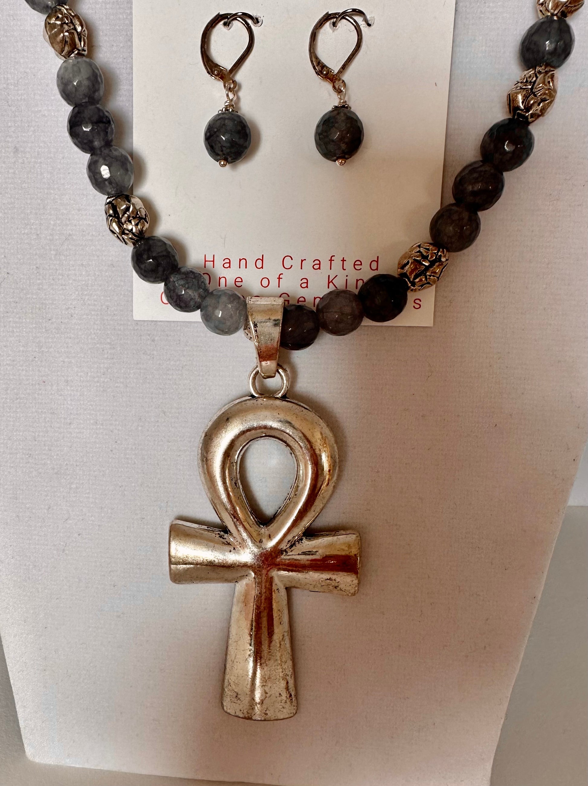 Grey Jade's gentle yet powerful properties are believed to instill a sense of calmness and grounding. It's said to encourage inner reflection, allowing you to navigate life's challenges with clarity and equanimity.  Grey Jade complements any ensemble while offering a reminder of serenity. Faceted grey jade beads are accented by silver plated bead spacers and a modern cross pendant. Toggle clasp closing. Length: 25 ”/46.35cm;  Ears ½ ”/1.27cm. Cross 3”/7.62 SKU: 2313