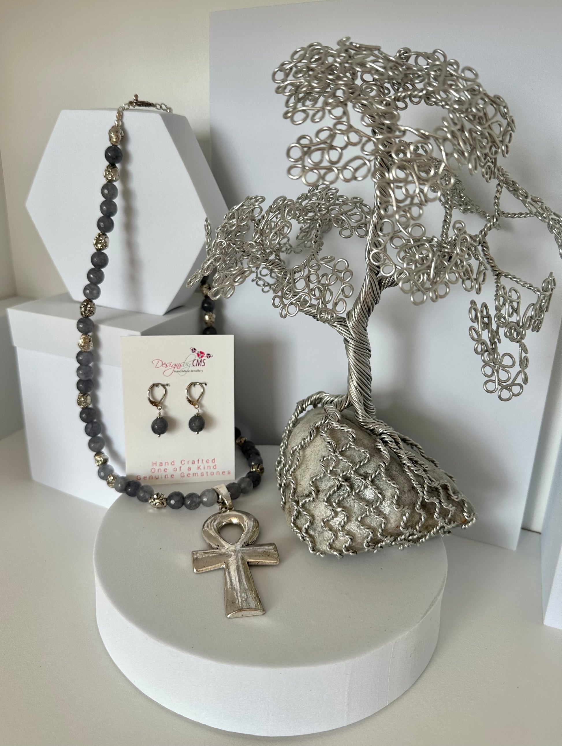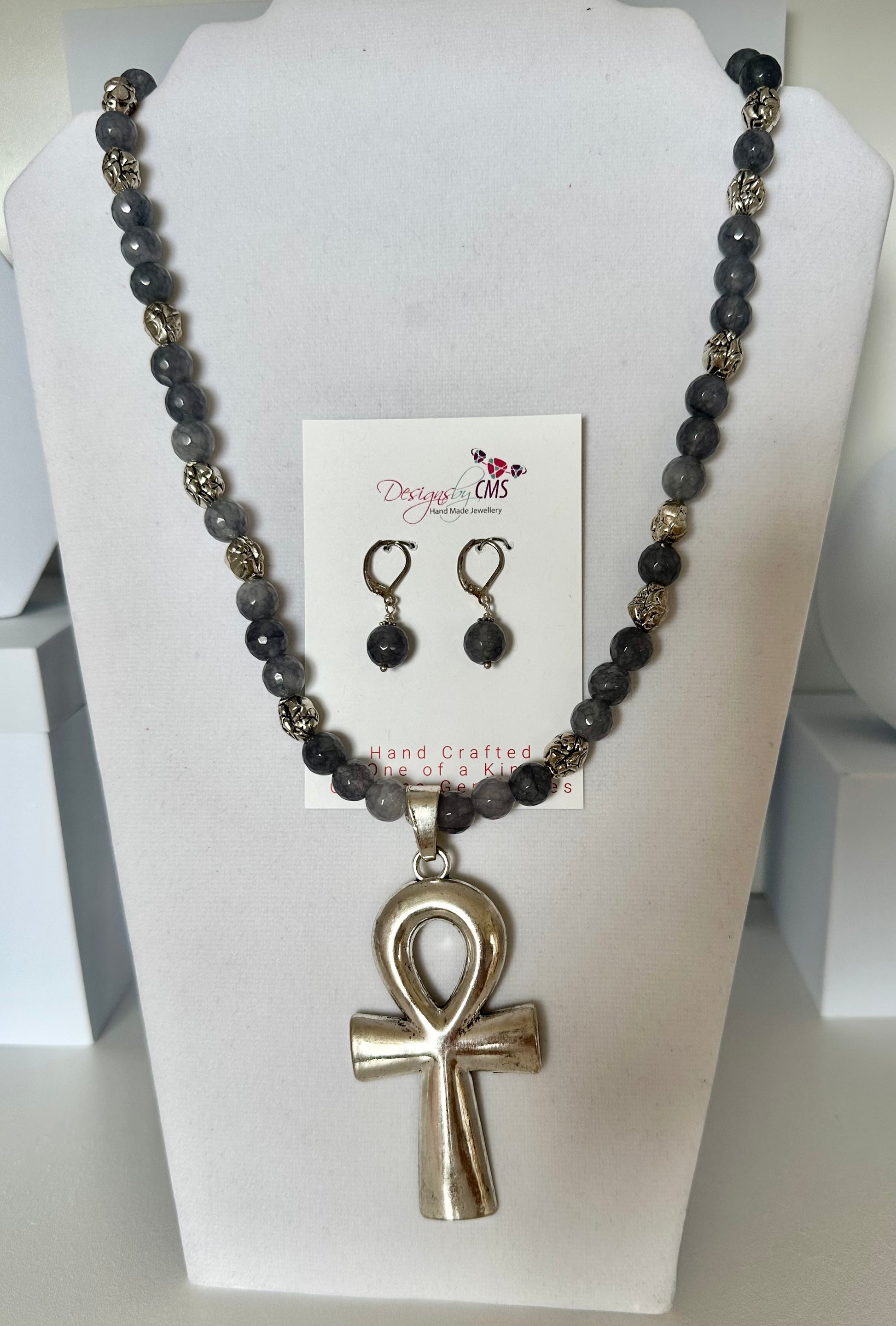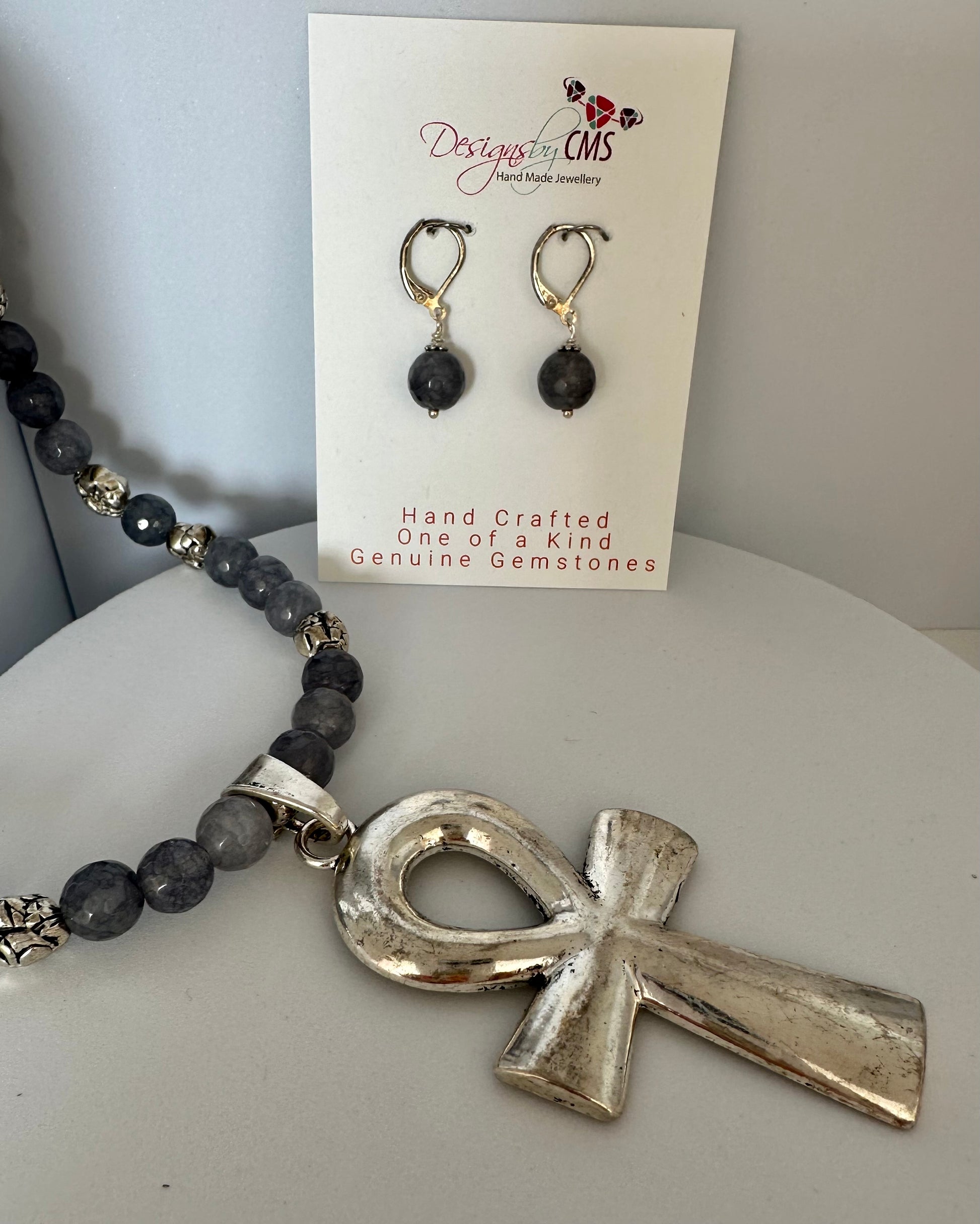 Grey Jade's gentle yet powerful properties are believed to instill a sense of calmness and grounding. It's said to encourage inner reflection, allowing you to navigate life's challenges with clarity and equanimity.  Grey Jade complements any ensemble while offering a reminder of serenity. Faceted grey jade beads are accented by silver plated bead spacers and a modern cross pendant. Toggle clasp closing. Length: 25 ”/46.35cm;  Ears ½ ”/1.27cm. Cross 3”/7.62 SKU: 2313